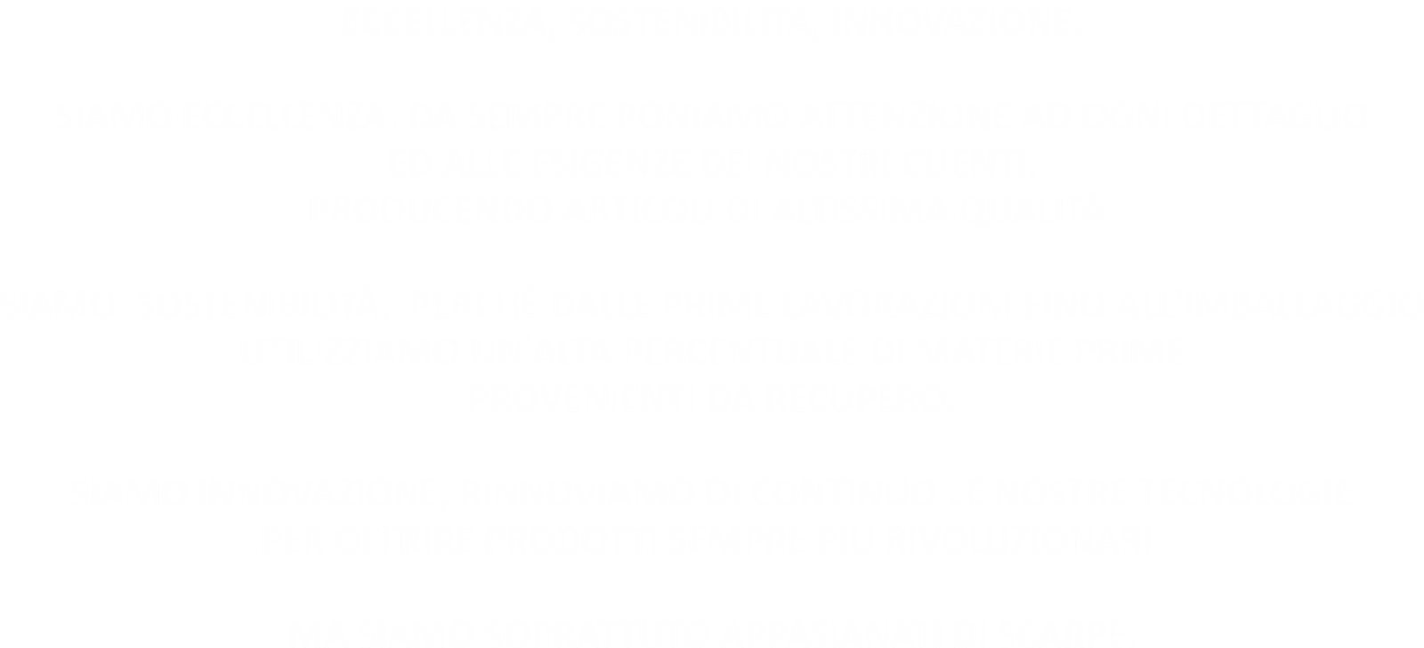 Siamo sostenibilità, perchè dalle prime lavorazioni fino all'imballaggio utilizziamo un'alta percentuale di materie prime proveniente da recupero.